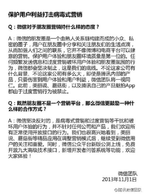 6、在21点30左右,微信再发声明,称:保护用户体验和朋友圈环境质量是第一位的。不论这家公司有什么背景、不论这家公司有多么大,即使是腾讯内部的产品,只要伤害到用户体验和用户利益,微信团队将一视同仁。