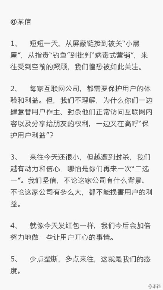 2、下午15:40分,腾讯发出声明回应“来往指责微信封杀”事件:微信没有封杀来往的域名。来往通过发布疑似钓鱼特征的链接触发了微信后台的自动保护机制。同时微信表示,已经人工解除了案例保护机制。